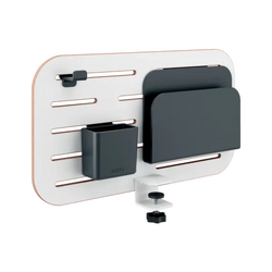 - Aceasta solutie de depozitare compacta si versatila poate fi montata deasupra unui birou sau agatata dedesubt pentru a profita la maximum de spatiul dvs. Sunt incluse trei accesorii pentru birou, toate realizate din 85% plastic reciclat post-consum: 1 x suport pentru agende, 1 x suport pentru pixuri si 1 carlig de agatat pentru casti Compatibil cu majoritatea birourilor care au o grosime maxima a blatului de 35 mm Designul modern si minimalist, cu colturi rotunjite, faciliteaza organizarea accesoriilor pentru depozitare in functie de preferintele dumneavoastra. Organizatorul Leitz Ergo este fabricat din placi de fibra durabila, de 8 mm, pentru a asigura rezistenta si stabilitate; Dimensiuni: 42x25cm fara clemele de fixare Clema este usor de instalat cu ajutorul cheii Allen furnizate (fara gaurire); benzile din cauciuc moale protejeaza suprafata biroului de zgarieturi Solutia ideala pentru organizarea mediului de lucru de acasa, dar si de la birou. Dimensiuni 450 x 330 x 61