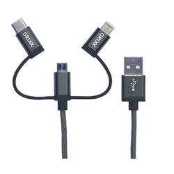 GroupDescription: # Cablul de date Grixx 3-in-1 este potrivit pentru incarcarea si sincronizarea tuturor tipurilor de echipamente cu conector Lightning, micro USB sau USB-C. # Cablul este impletit din Nylon, ceea ce il face mai ferm decat, de exemplu, cablurile din silicon. # Conectorii sunt din aluminiu pentru o durabilitate suplimentara.
