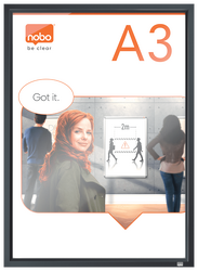 - Suportul de afisare prezinta o rama eleganta cu cleme cu profil redus, colturi taiate cu precizie fara sudura si un mecanism inovator pentru inlocuirea continutului. Pur si simplu, scoateti rama de afisare frontala, schimbati continutul din spatele capacului transparent si reinstalati rama de afisare cu ajutorul conexiunii "push click fit". Aceasta solutie de afisare stabila si securizata include un panou posterior fixat ferm pe perete prin montajul in colturi, permitand inlocuirea continutului fara a scoate cadrul de pe perete. Designul sau inovator modernizeaza o abordare traditionala a afisarii, facand procesul de inlocuire a documentelor rapid si simplu. Dimensiunea zonei de afisare este A3.