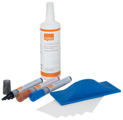 Kit pentru tabla NOBO emailata, suport, 4 markere, burete , spray curatare 12 ml, laveta, 10 magneti