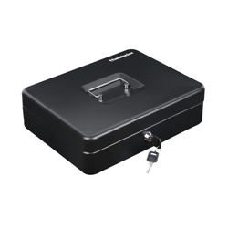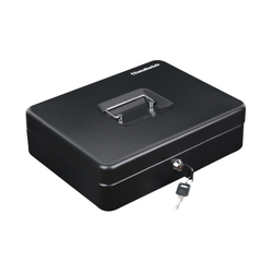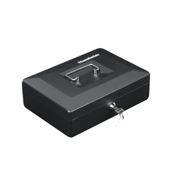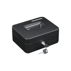 - O cutie de bani de mici dimensiuni, cu o constructie solida din otel si colturi rotunjite, prevazuta cu o incuietoare cu cheie de securitate si un maner rabatabil pentru a fi transportata cu usurinta.